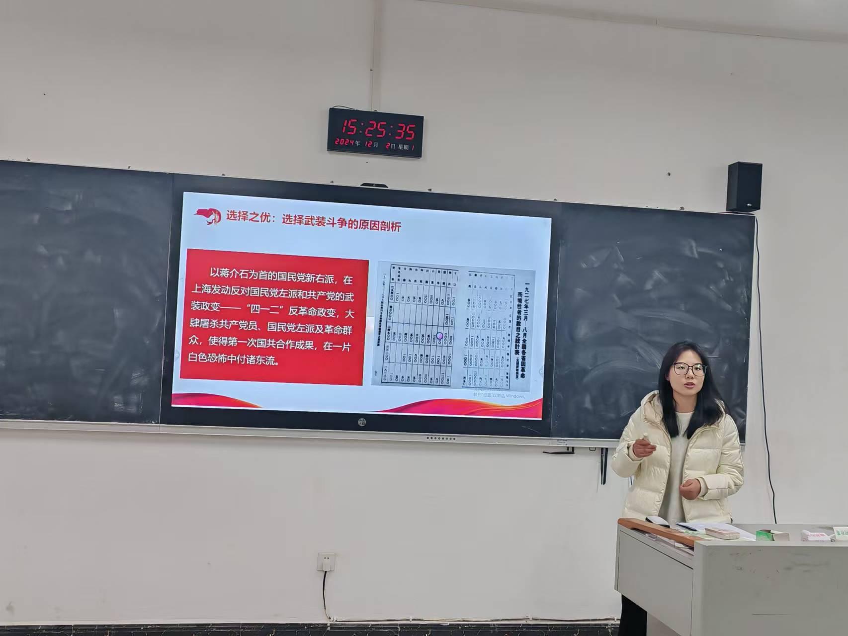 比赛开始之前主持人讲明了此次活动的意义并宣读了比赛规则和评分标准。在本次教学能力大赛中教师选题涉及范围广泛,包括思想道德与法治、毛泽东思想和中国特色社会主义理论体系概论、习近平新时代中国特色社会主义思想、形势与政策;选题内容丰富,从杨佳老师的“理想的特征”、代利老师的“辩证对待人生矛盾”、唐瑜老师的“社会主义法治思维的培养”、许智亮老师的“社会主义初级阶段理论”、陈静锐老师的“中国革命为什么要走新道路”、王谌男老师的“武装斗争:夺取革命胜利的金钥匙”、龙思达老师的“新民主主义革命的经济纲领”、刘回香老师的“中国精神的基本内涵”、魏瑜敏老师的“伟大建党精神”、肖杨老师的“爱国主义的内涵”、刘何洁老师的“为实现中国梦注入青春能量”、邱芳老师的“大力推进现代化产业体系建设,加快发展新质生产力”、刘露老师的“实现中华民族伟大复兴的中国梦”等展示出丰富多彩的主题。各参赛选手准备充分,教学思路清晰,教学方法多样,充分显示出公司思政课教师的政治素养、教学功底、精神风貌和教学技能,呈现出了一场高效生动的思政课。
